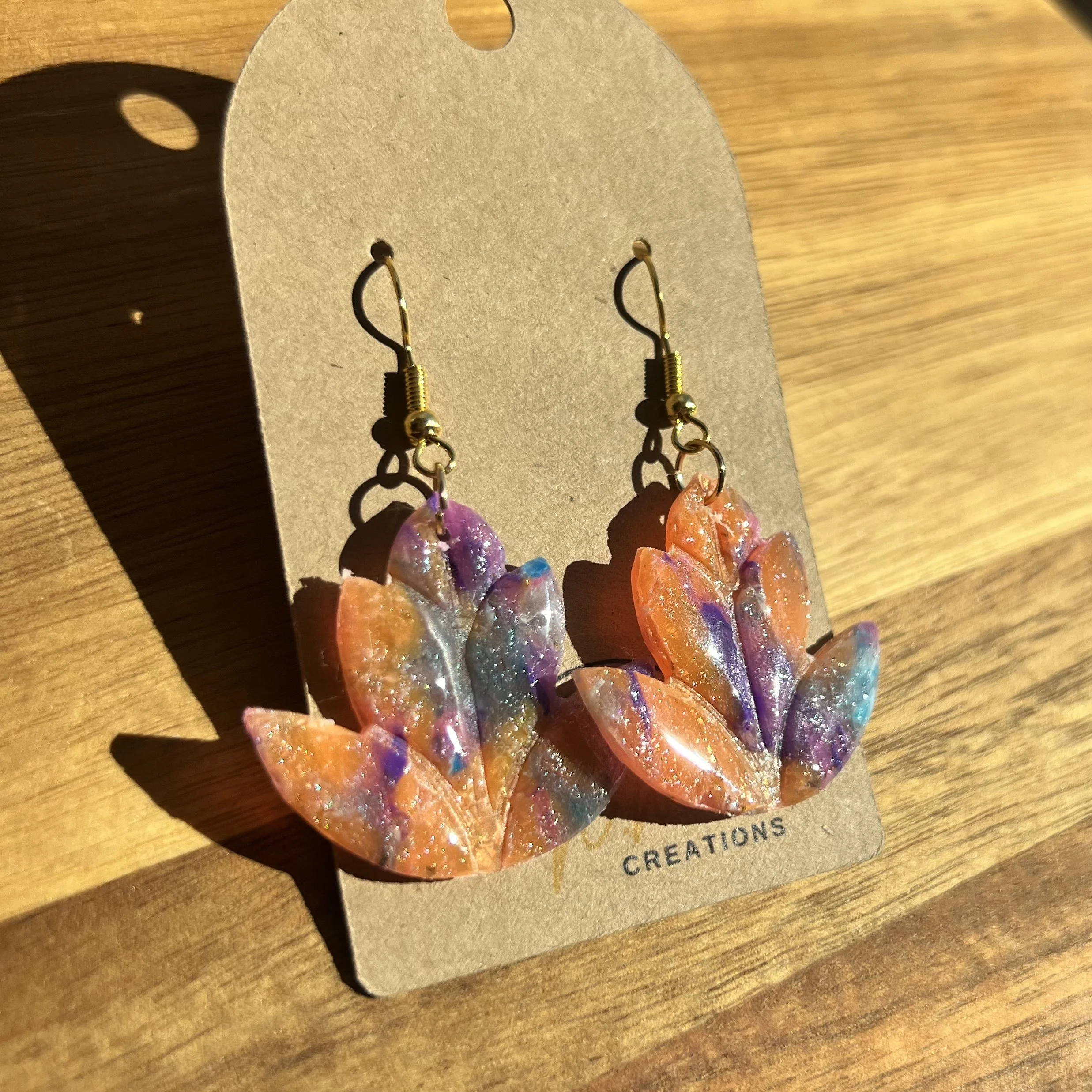 Purple, pink, orange, and blue translucent polymer clay earrings marbled with mica powder